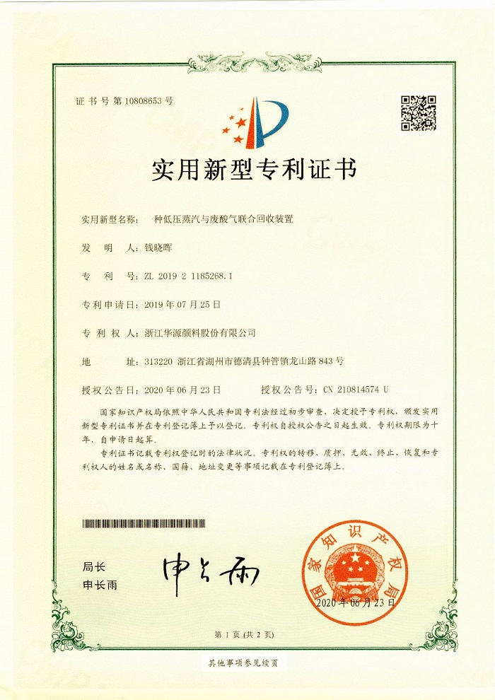 近日,升華集團所屬企業華源顏料6項實用新型專利獲國家知識產權局授權。這6項專利分別是:《一種氨氮廢水與酸霧的聯合回收處理裝置》、《一種工廠雨水收集利用裝置》、《一種低壓蒸汽與廢酸氣聯合回收裝置》、《一種投料倉》、《一種振動給料器》、《一種氮氧化物廢氣與酸霧聯合回收裝置》。