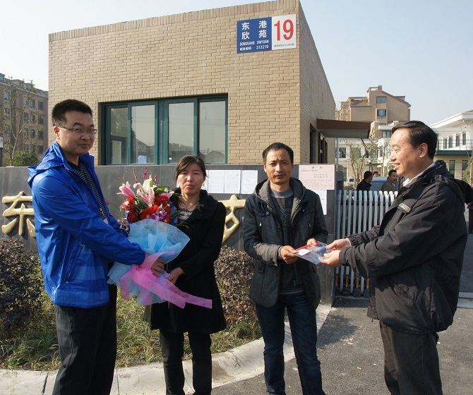 當(dāng)天上午8點38分,東港欣苑大門口,該鎮(zhèn)洋北村村民仲水根滿臉堆笑地從縣臨杭開發(fā)區(qū)管委會副主任繆曉林手中接過了8幢301室的鑰匙,他身旁的妻子則從升華地產(chǎn)集團雷甸項目負責(zé)人楊韓狄的手中接過了升華送出的賀喜鮮花,歡迎該小區(qū)第一位業(yè)主的到來。