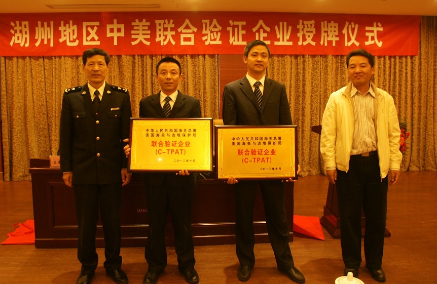 符合要求的企業(yè)不出國(guó)門,就能獲得企業(yè)輸美貨物在美國(guó)通關(guān)時(shí)的便利措施。11月12日下午,湖州地區(qū)中美聯(lián)合驗(yàn)證企業(yè)授牌儀式在我縣莫干山大酒店舉行,云峰新材兩骨干子公司浙江升華云峰進(jìn)出口有限公司、德清縣升強(qiáng)木業(yè)有限公司獲得由國(guó)家海關(guān)總署、美國(guó)海關(guān)與邊境保護(hù)局共同簽發(fā)的C-TPAT聯(lián)合驗(yàn)證證書。湖州海關(guān)關(guān)長(zhǎng)殷杭俊、德清縣副縣長(zhǎng)王少華出席授牌儀式,云峰新材總經(jīng)理沈衛(wèi)文在授牌儀式上發(fā)言。